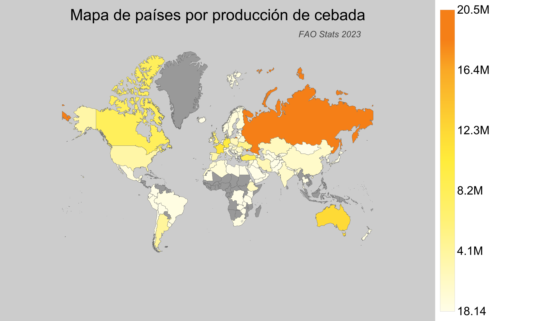 La cebada es un cultivo esencial en la agricultura mundial por su versatilidad y adaptabilidad. Crece bien en climas templados y semisecos, lo que la hace ideal para diversas regiones agrícolas del mundo. Esta página ofrece datos sobre la producción de cebada del año 2023, según la base de datos de la Organización de las Naciones Unidas para la Alimentación y la Agricultura (FAO), que presenta la información más reciente de 2025.