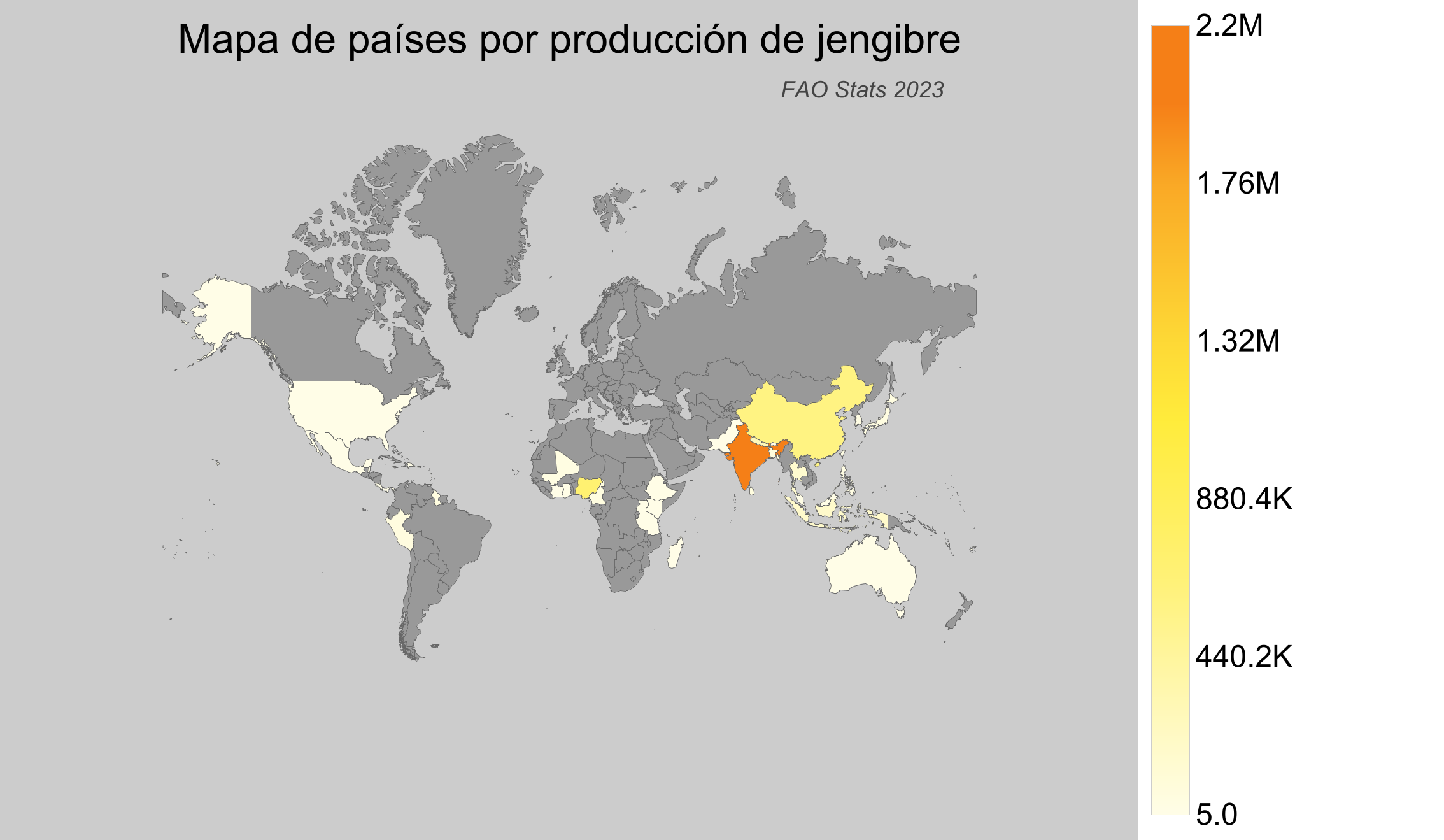 - México, aunque no se encuentra entre los principales productores, contribuyó con 2,705 toneladas de jengibre, ocupando el puesto 25 a nivel mundial.