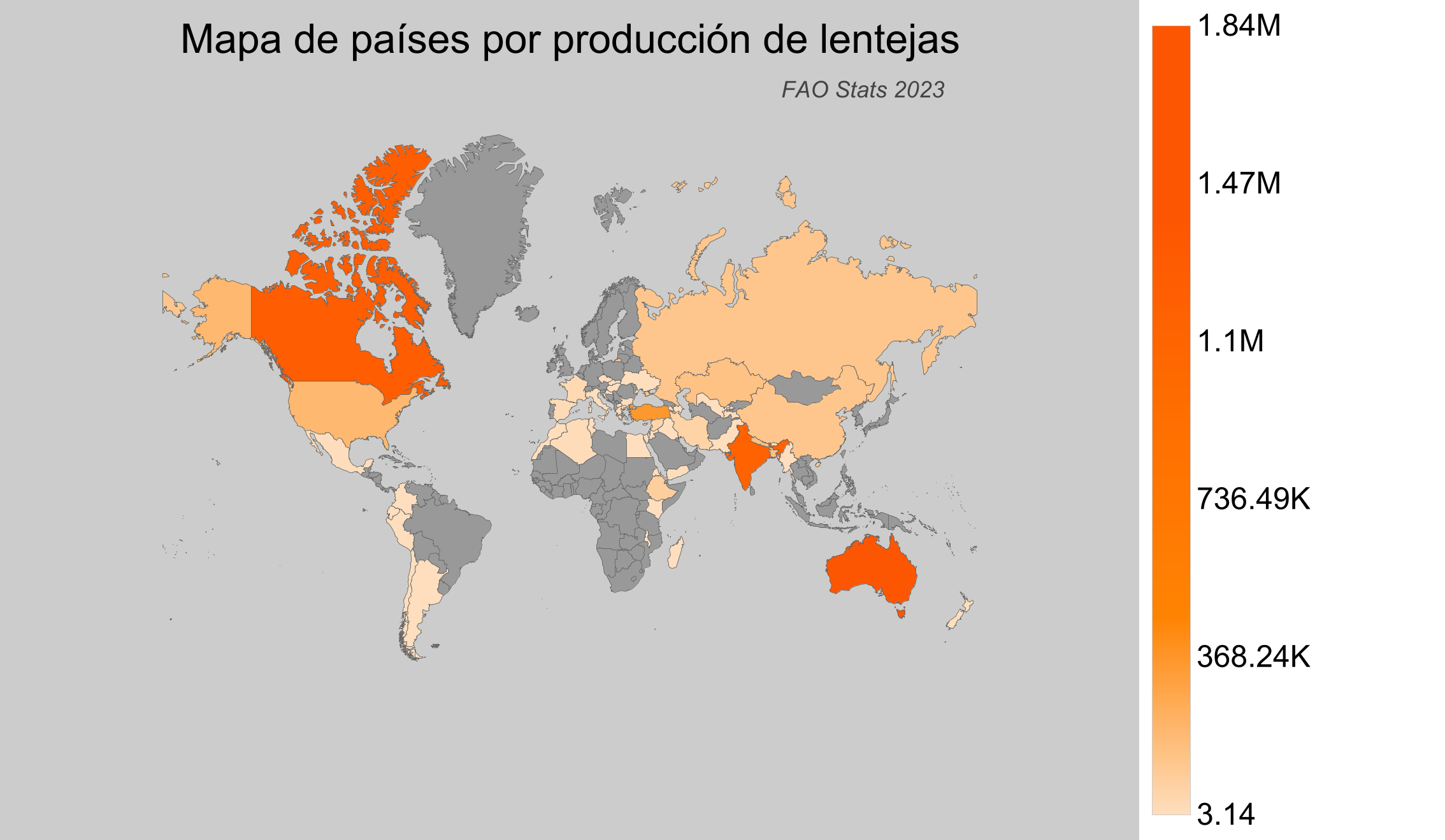 Las lentejas son un recurso agrícola vital en todo el mundo, conocidas por su alto contenido en proteínas y fibra. Crecen principalmente en climas templados y semiáridos, adaptándose bien a regiones diversas. Este análisis presenta los datos más recientes del año 2023, según la base de datos de estadísticas de la Organización de las Naciones Unidas para la Alimentación y la Agricultura (FAO).