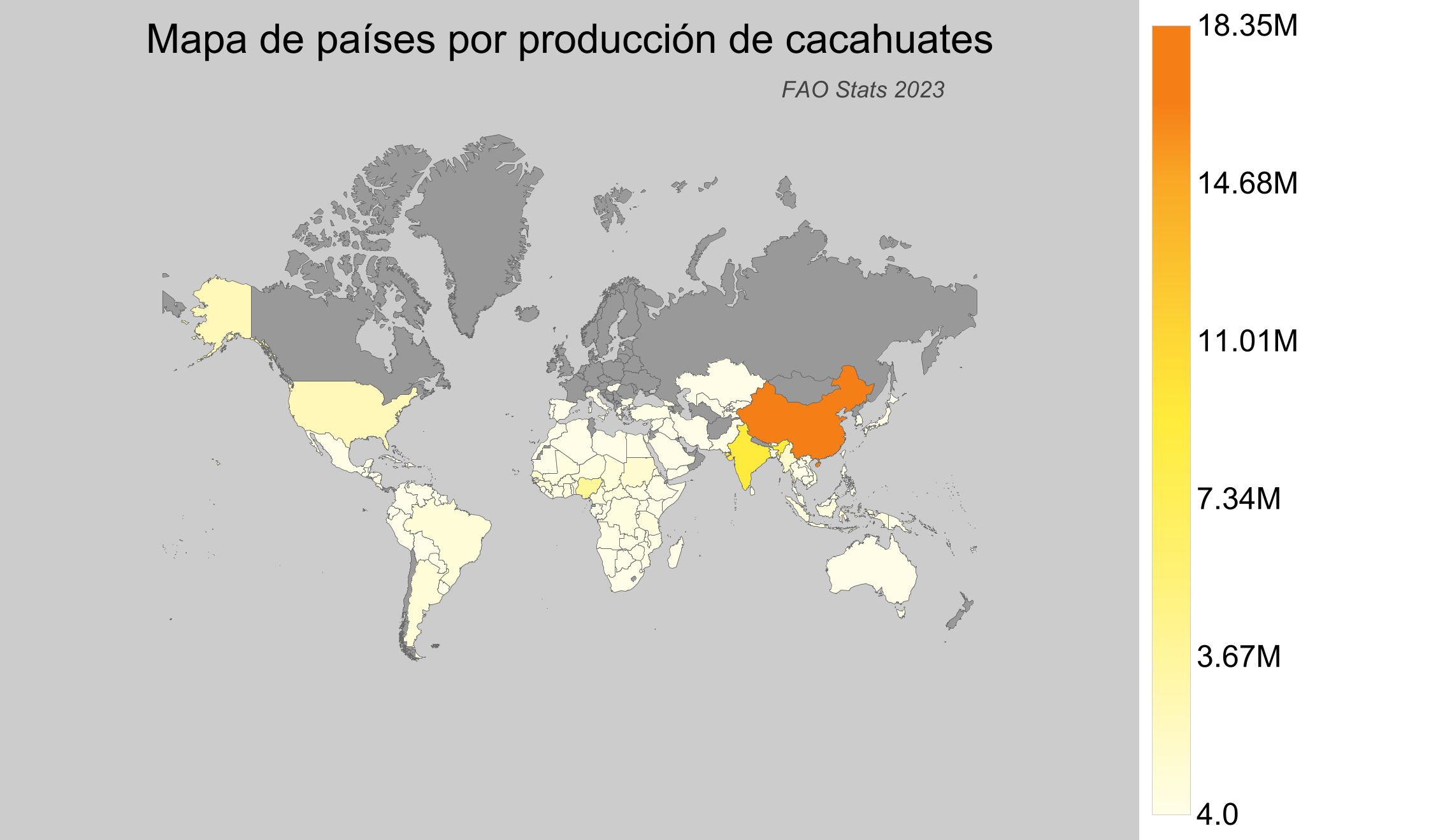 - China lidera la producción de cacahuetes con aproximadamente 18.4 millones de toneladas en 2023.