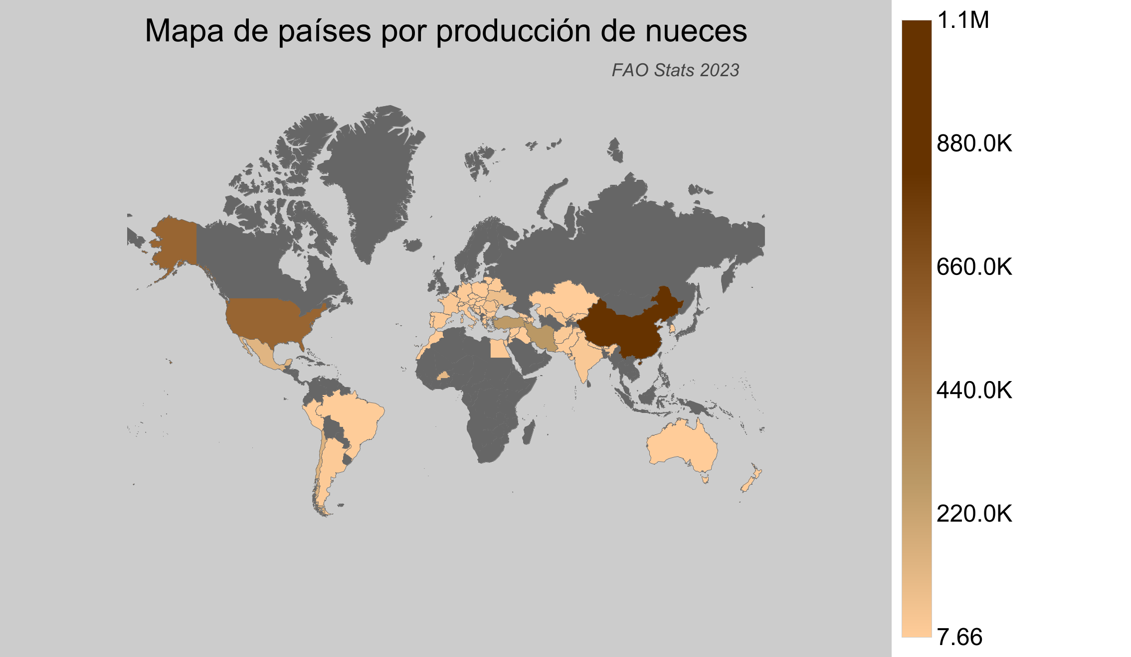 La nuez es un fruto seco crucial en la dieta global debido a su riqueza nutritiva y sus beneficios para la salud. Crece predominantemente en regiones con climas templados, favoreciendo su cultivo y producción de manera efectiva. La presente información refleja los datos del año 2023, los cuales son los más recientes disponibles según la base de datos de la Organización de las Naciones Unidas para la Alimentación y la Agricultura (FAO) de 2025.
