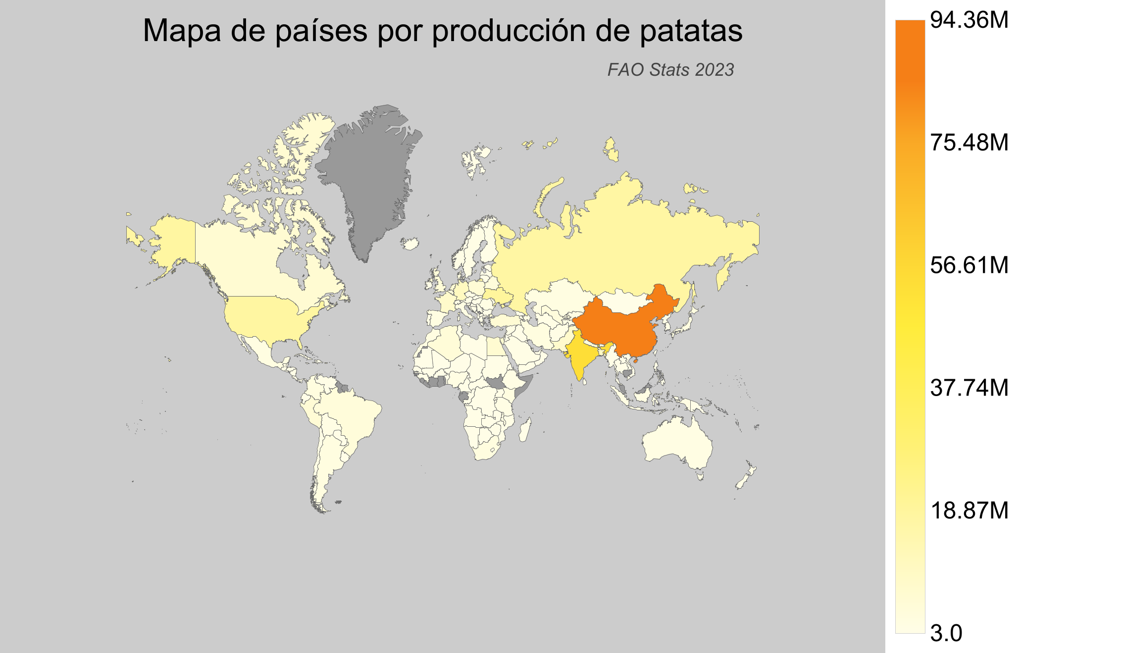 - China es el líder mundial en producción de papa, con alrededor de 94 millones de toneladas en 2023, mostrando su fuerte capacidad agrícola.