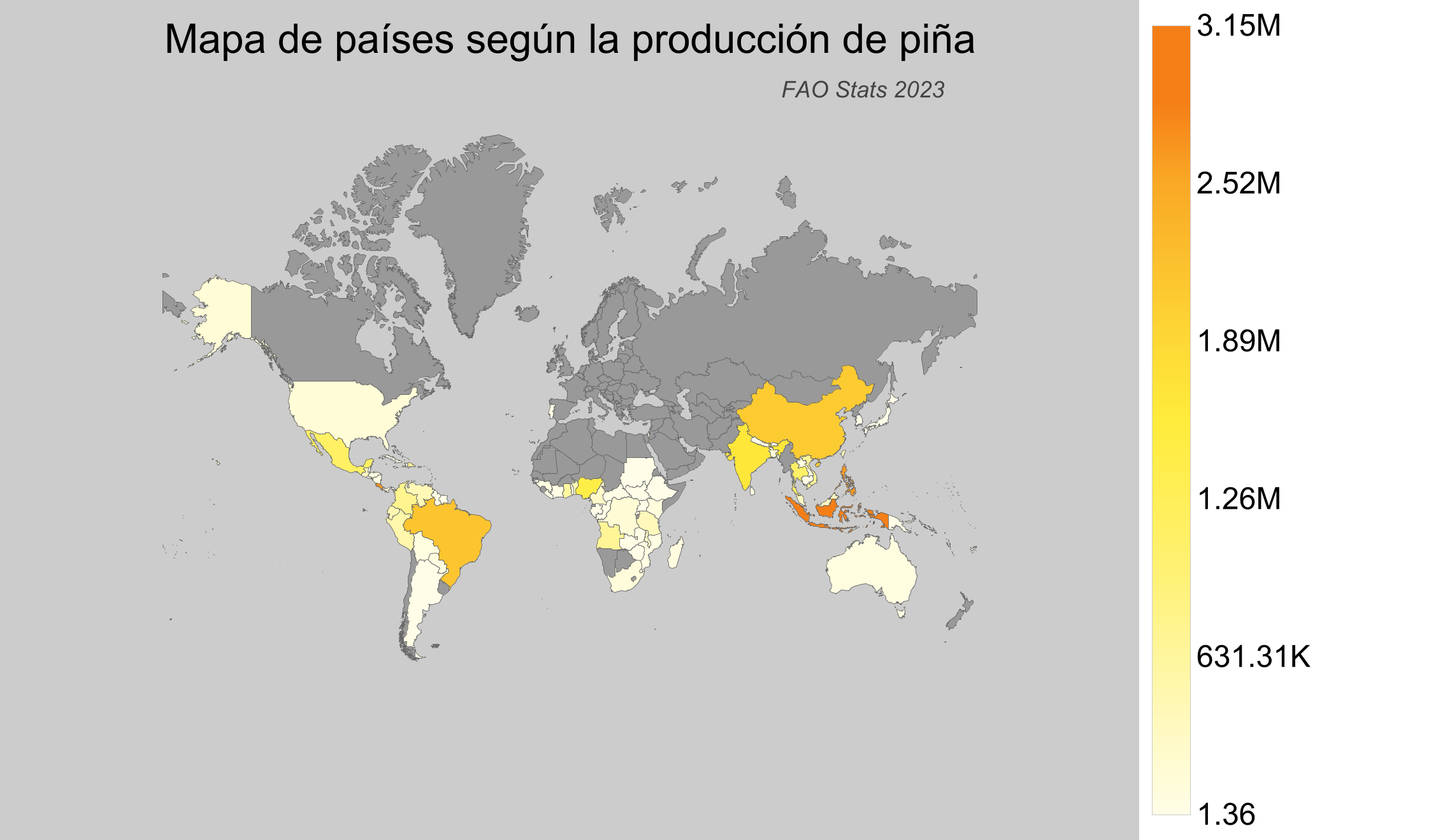 - Indonesia es uno de los líderes en la producción de piñas, con alrededor de 3.16 millones de toneladas en 2023.